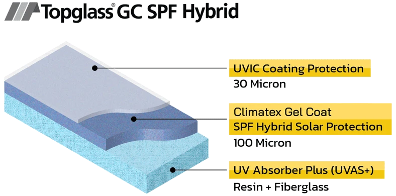 - ผ่านการทดสอบอย่างเข้มงวดในประเทศไทย แสดงให้เห็นว่า Topglass GC SPF Hybrid มีความสามารถในการสะท้อนแสงอาทิตย์เกือบสองเท่าของผลิตภัณฑ์ไฟเบอร์กลาสธรรมดา