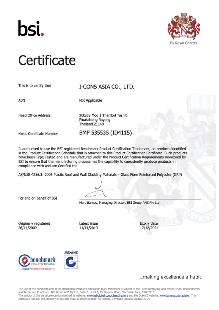 - ได้รับมาตรฐาน AS/ NZS 4256.3 :2006 Client BMP NO.535535 มาตรฐานจากออสเตรเลีย ที่ได้รับการยอมรับกว่า 90 ประเทศทั่วโลก