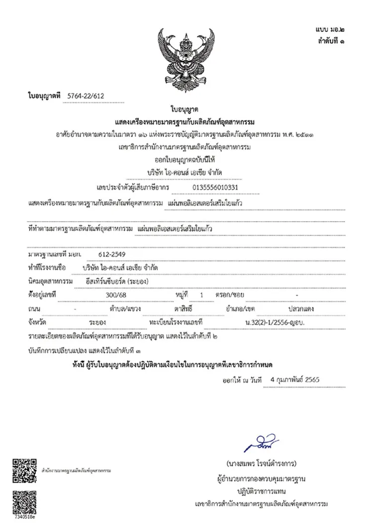 - ได้รับมาตรฐานอุตสาหกรรม มอก. 612-2549 ของประเทศไทย
