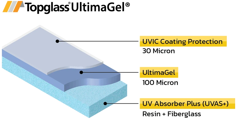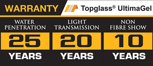 - Topglass® UltimaGel ที่ผลิตตามข้อกำหนดของ AS 4256:3.2006 ต้านการสลายละลายด้วย UV และไม่เปลี่ยนสีนานกว่าที่ปกติที่พบในผลิตภัณฑ์หลังคาทรานซลูเซนต์เกรดทั่วไป