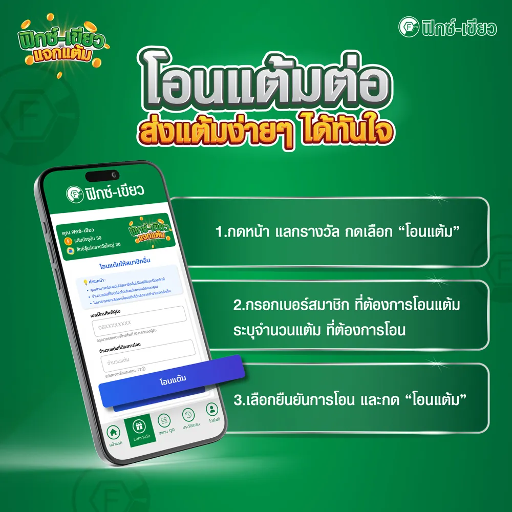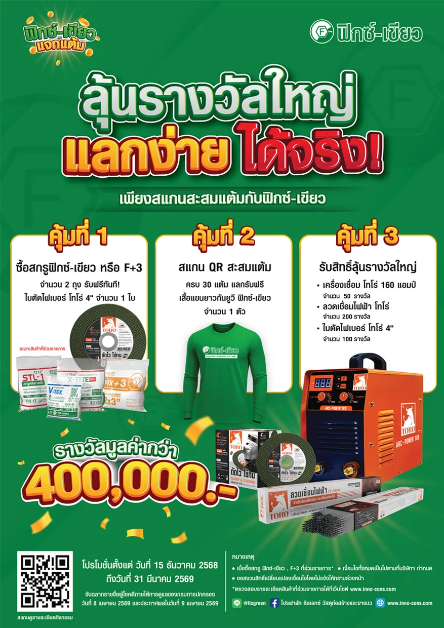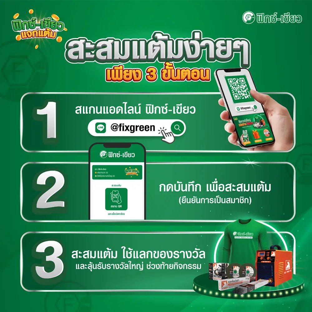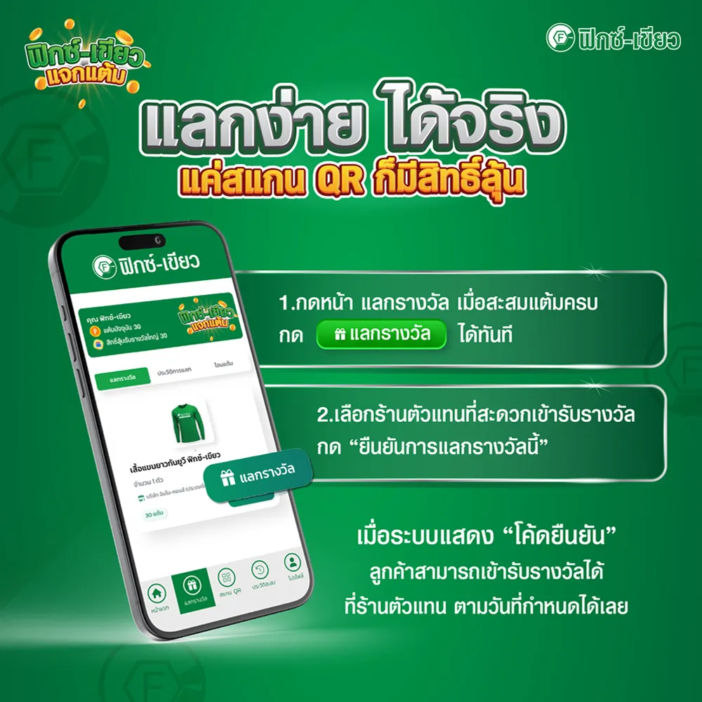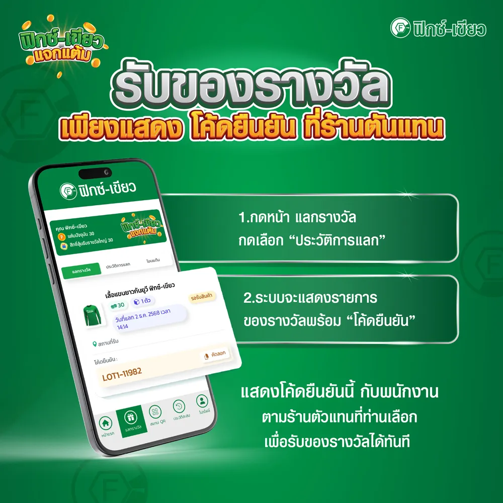- ผู้โชคดีต้องติดต่อแสดงตัวตนผ่าน Line @fixgreen หรือโทร 081-935-5066 เพื่อยืนยันสิทธิ์และรับรายละเอียดของรางวัล